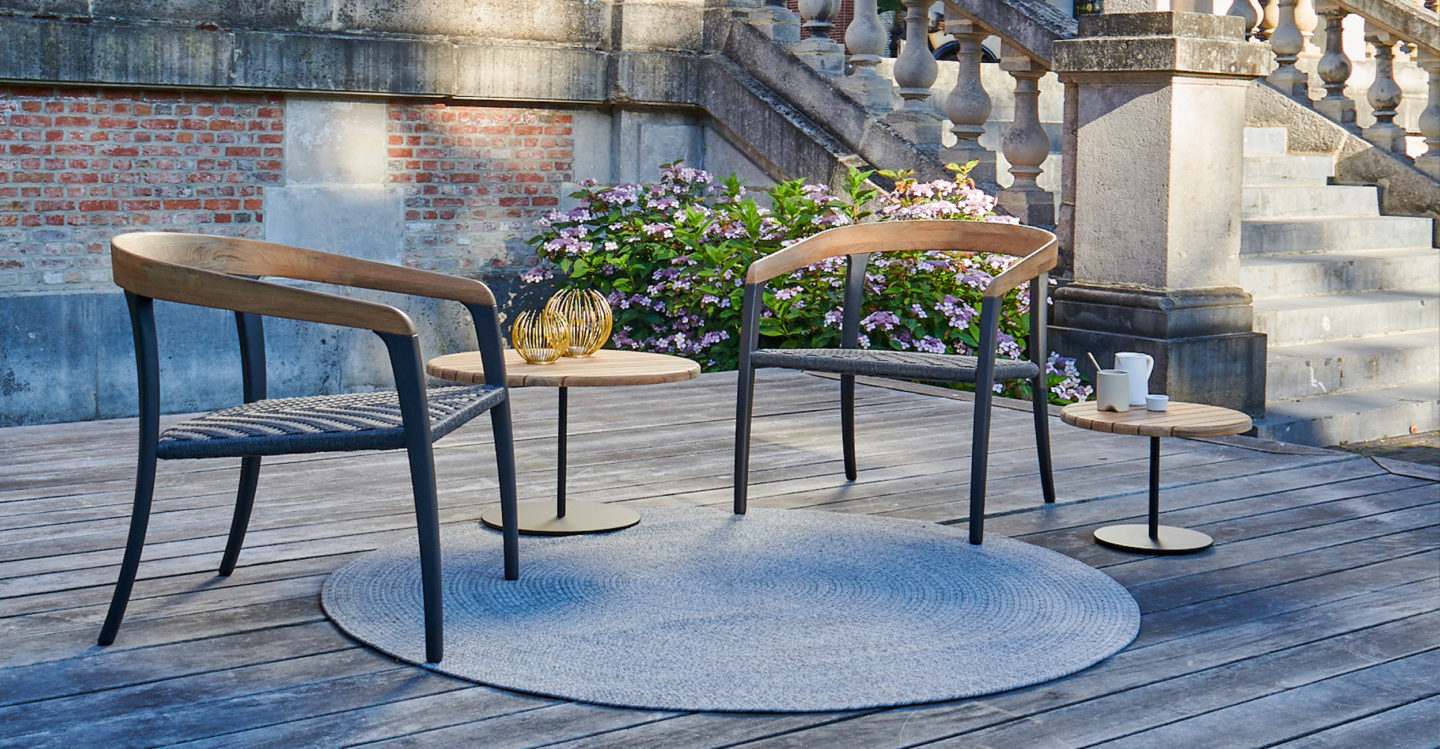 Do you want your garden furniture to stand out? Then we are sure you will love the new Jive. This garden chair combines in a very harmonious way teak with tapered aluminum profiles and olefin fiber into an inviting, very decorative and refreshing chair. Due to the marriage of these materials, the chair is a chameleon and will fit both with a contemporary looking table as well with a warm teakwooden table!